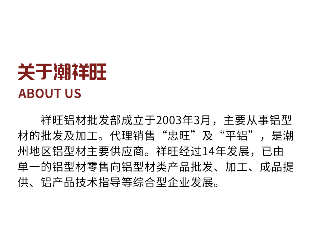 • 祥旺鋁材批發部成立于2003年3月,主要從事鋁型材的批發及加工。
